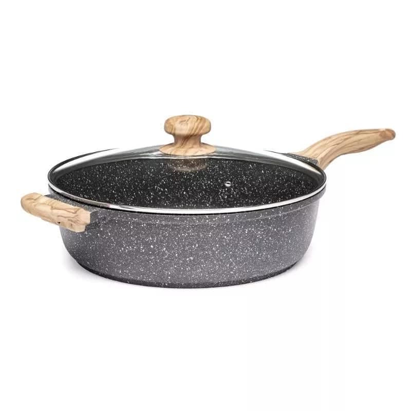 This pan isn’t just about cooking; it’s about bringing joy and ease to your kitchen routine. The non-stick surface ensures your food cooks perfectly without sticking, making both cooking and cleaning a breeze. The glass lid allows for convenient monitoring of your dishes, saving you from the hassle of constantly lifting the lid to check progress. Its unique charcoal speckle design, complemented by olivewood accents, adds a touch of elegance to your kitchen décor, making it more than just cookware – it’s a statement piece.