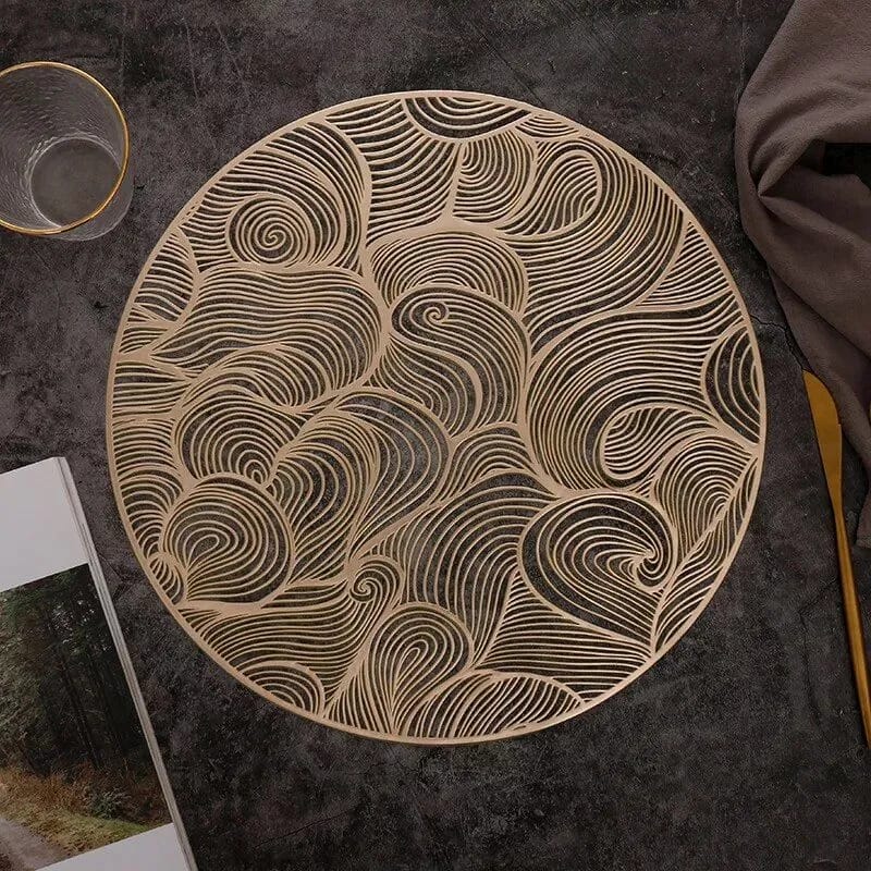 Introducing our Modern Round PVC Placemat, a perfect blend of style and functionality for your dining table. Designed to elevate your dining ambiance, this placemat is a must-have for those who love to blend practicality with elegance. The intricate hollow design with hot gold accents adds a touch of light luxury to every meal.